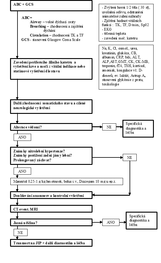 Při příjezdu akutního pacienta do zdravotnického zařízení jsou některé principy péče považovány za základní: diagnostická rozvaha probíhá současně s vyšetřováním a zajišťováním vitálních funkcí. Hlavním smyslem činnosti je přežití nemocného s co nejmenším residuálním deficitem a co nejmenší následnou morbiditou, což má zajistit základní postup znázorněný v diagramu (obr.). V následujícím textu jsou podrobněji popsány základní klinické projevy, diagnostické a léčebné postupy u poruch vědomí. Jednotlivé diferenciálně diagnostické možnosti a specifické diagnostické a léčebné postupy budou tématem dalších kapitol.