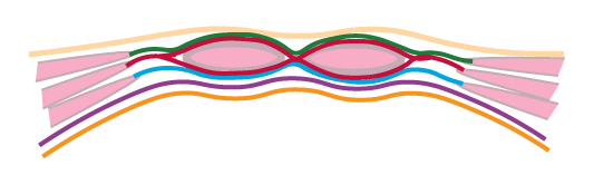zeleně - aponeuróza m. obliquus externus abdominis jde ventrálně od m. rectus abdominis. červeně - aponeuróza m. obliquus internus abdominis jde pouze ventrálně od m. rectus abdominis. modře - aponeuróza m. transversus abdominis jde ventrálně od m. rectus abdominis. fialově - fascia transversalis |