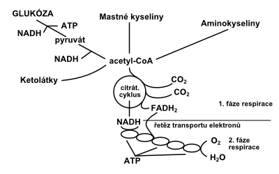 - Redukcí kyslíku v mitochondriích prostřednictvím transportů elektronů z reduktantů, tj. sacharidů, tuků nebo proteinů (transportní řetěz elektronů sestávající z cytochromů, flavoproteinů a nikotinamidnukleotidů).