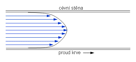 Laminární proudění – modré šipky označují směr pohybu jednotlivých vrstev kapaliny.