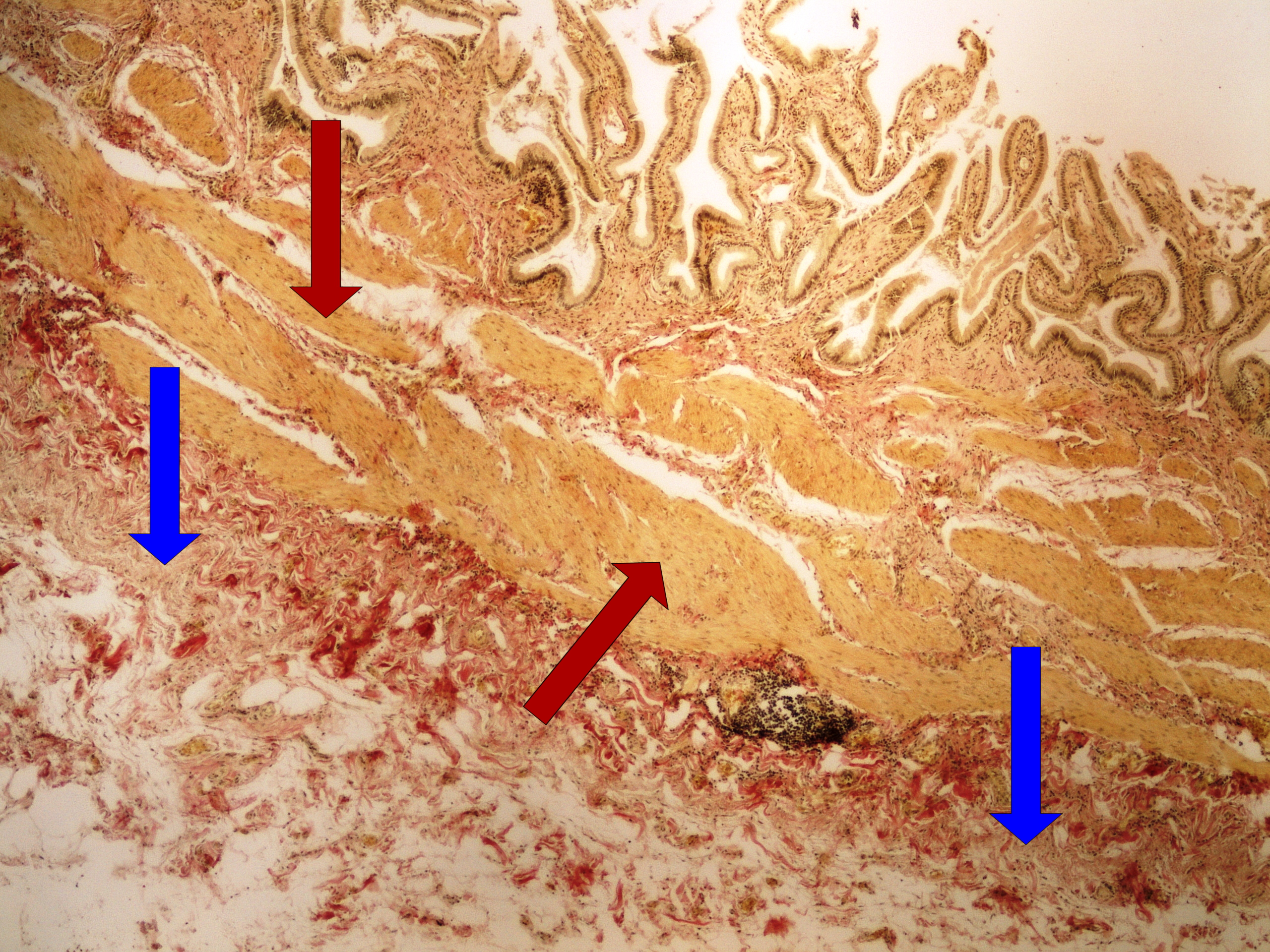 Preparát č.11 a č.12 - barvení van Gieson (žlučník)
