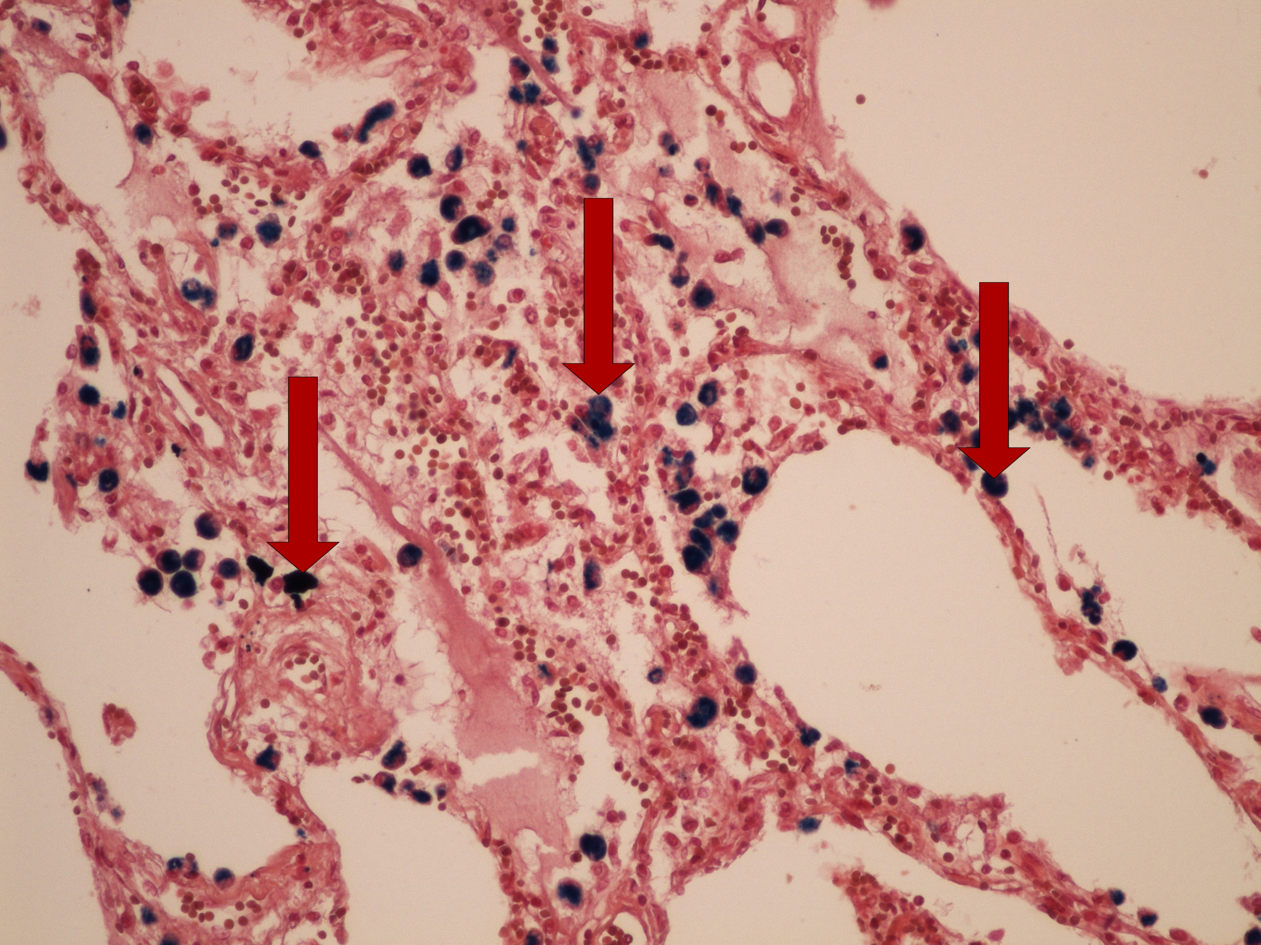 Preparát č.19 a č.20 - průkaz železa Perlsovou reakcí (plíce)