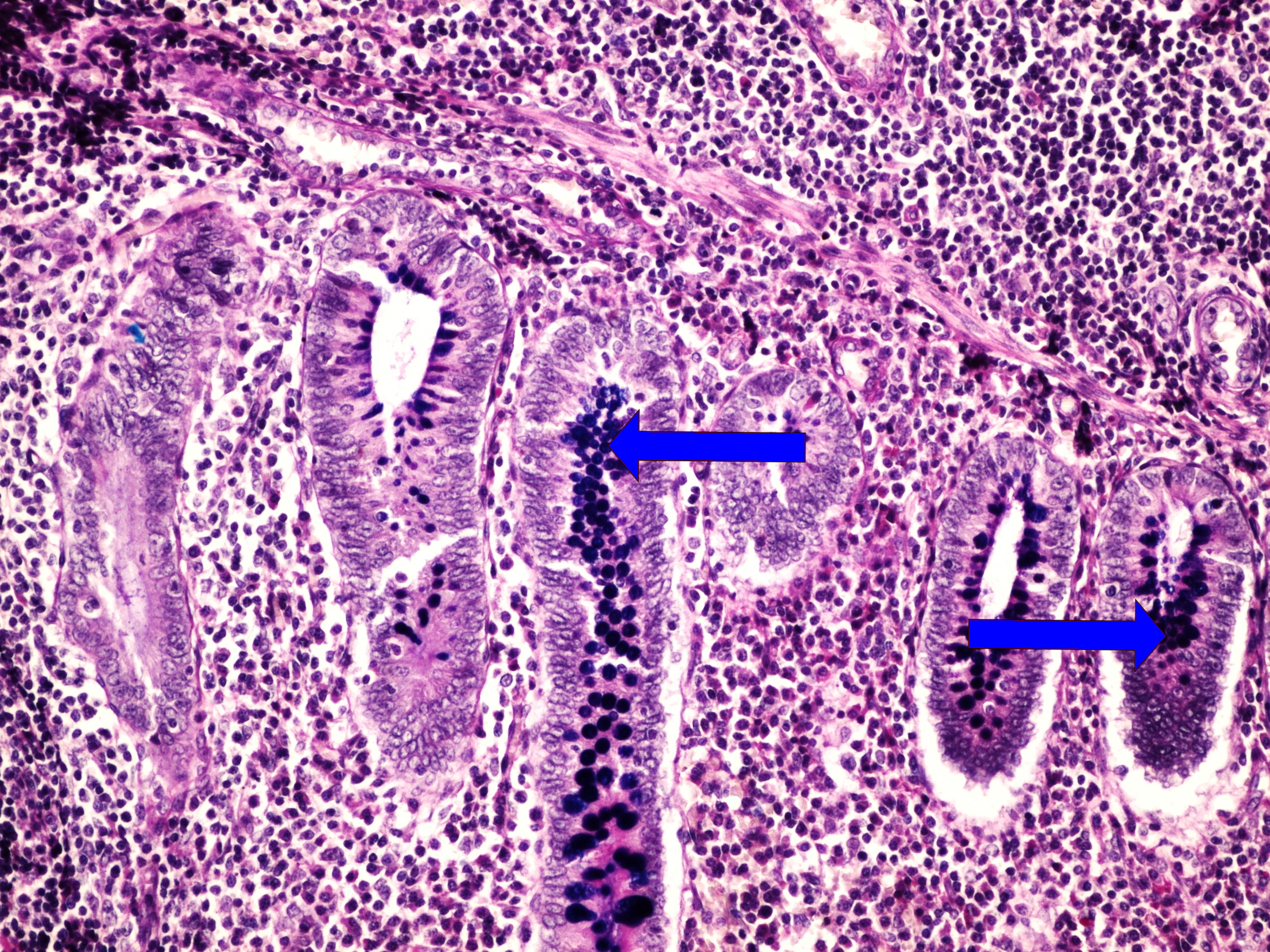 - intracytoplazmatické hlenové vakuoly v buňkách výstelky sliznice