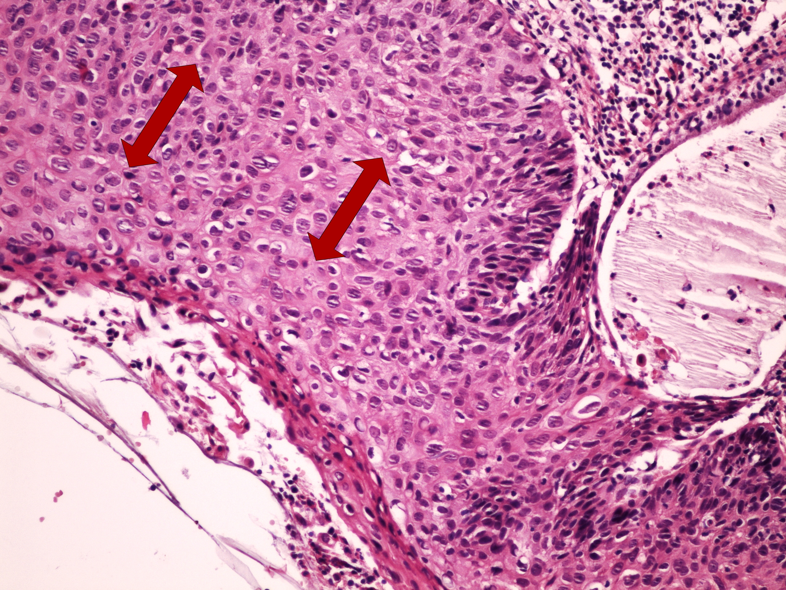 - atypie v celé šíri epitelu
